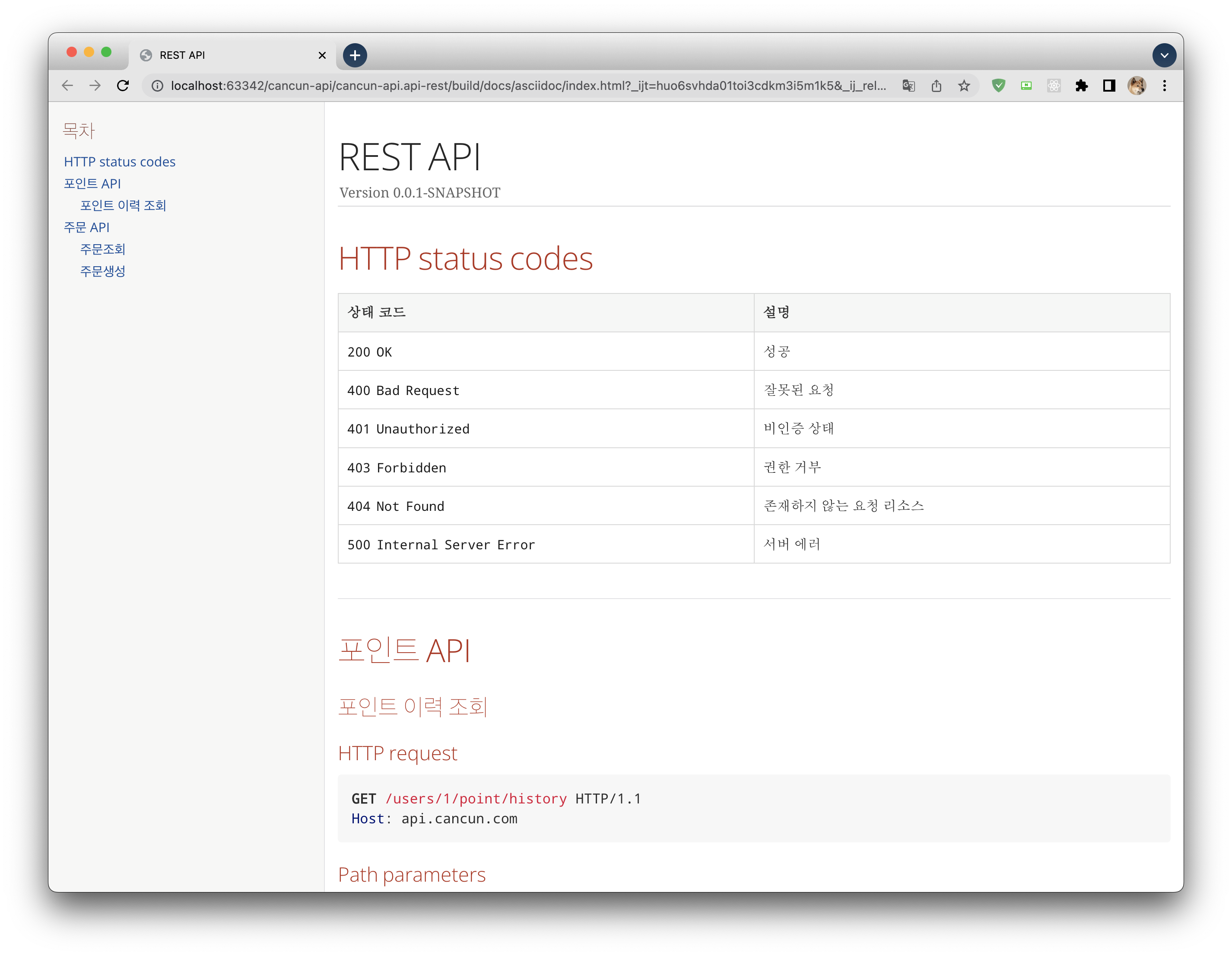 서버를 실행시키고 localhost:포트/docs/index.html을 브라우저에서 보면 다음과같이 나타나게 된다. 아래는 index.html을 직접 연 화면이다